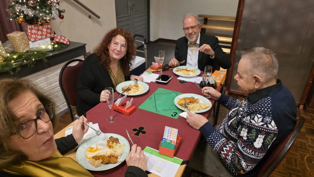 Niets zo mooi als een avond waarop alles klopt en precies dat gebeurde tijdens de leukste bridgedrive van het jaar van Bridgeclub Nepomuk. Op 17 december j.l. stroomde gelegenheidslocatie “De Kamp” in Boukoul vol met enthousiaste leden die werden verwelkomd met een lekker glaasje bubbels. Velen waren feestelijk uitgedost in hun mooiste kerstoutfits, klaar voor een avond vol kaarten, lachen en samen genieten.